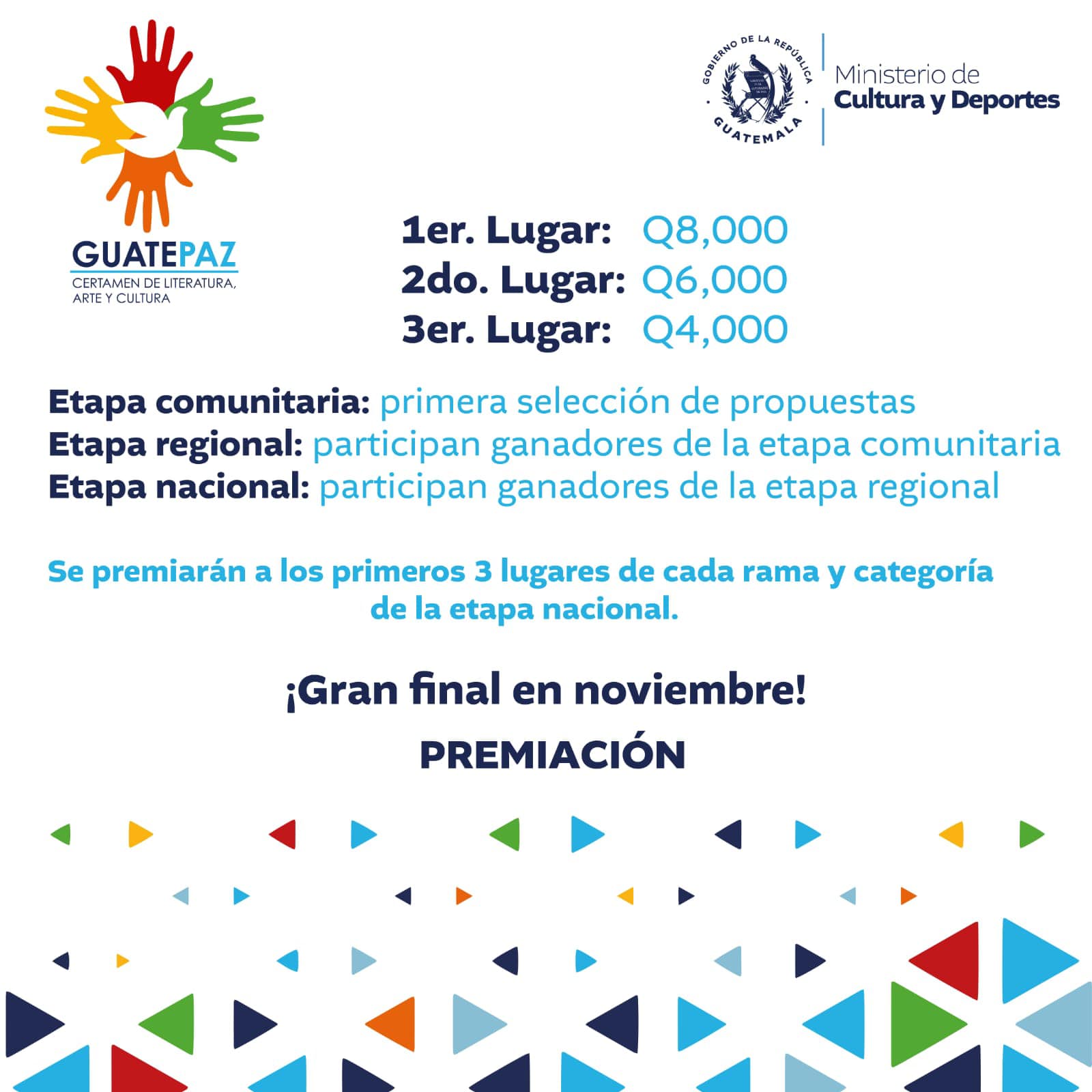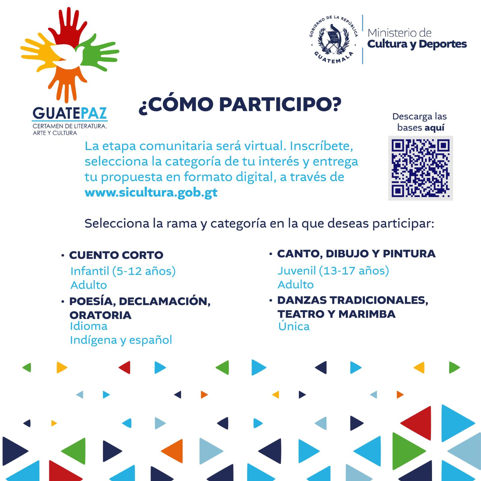 La etapa comunitaria será virtual. Inscríbete, selecciona la categoría de tu interés y entrega tu propuesta en formato digital a través de www.sicultura.gob.gt.
